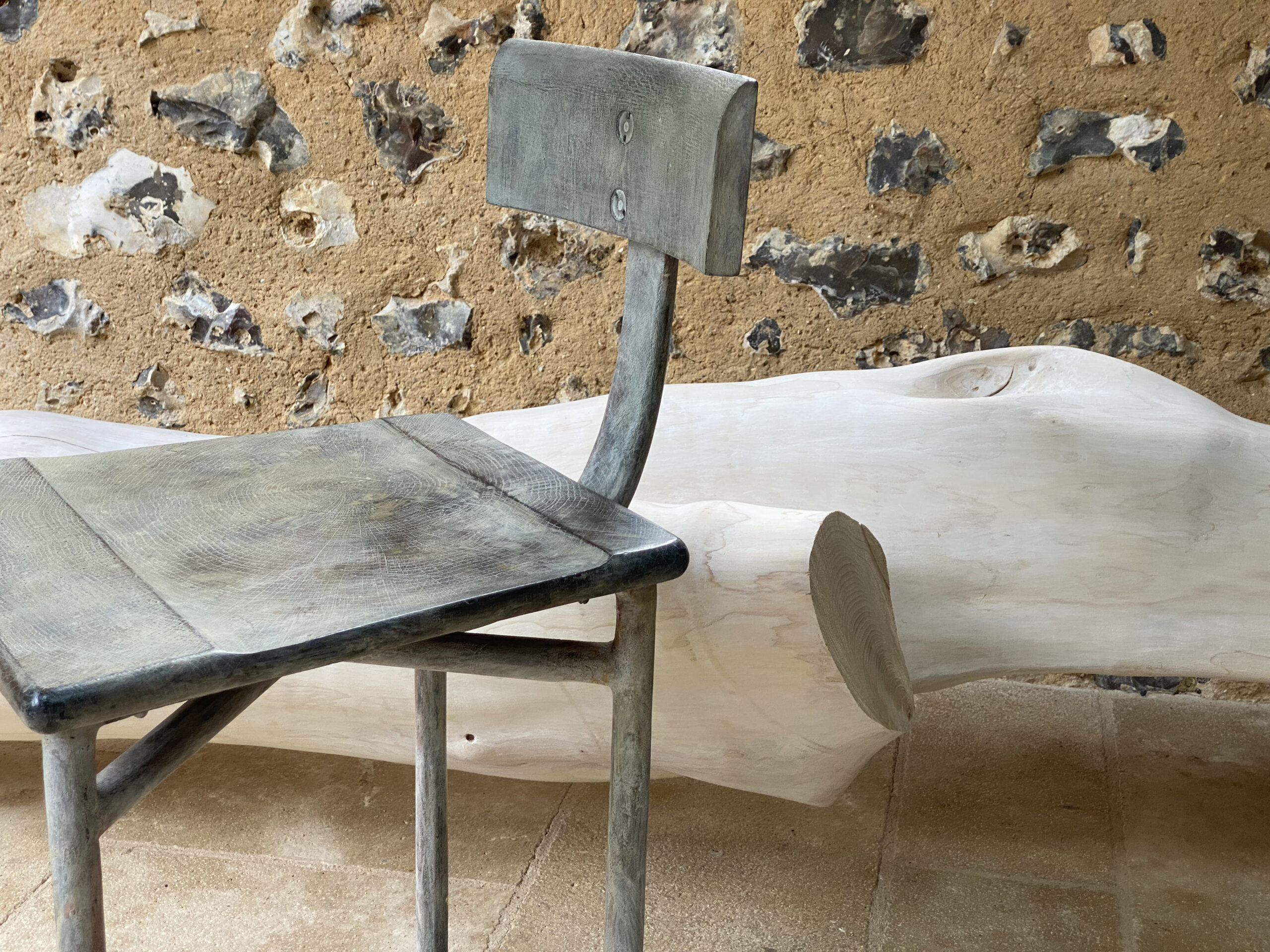 Die Stuhl- und Tischobjekte gleichen Bewohnern eines surrealen Waldes aus liegenden Baumstämmen, die schimmernde weiße Lasur zaubert das Mondlicht zurück auf die Oberfläche.